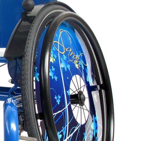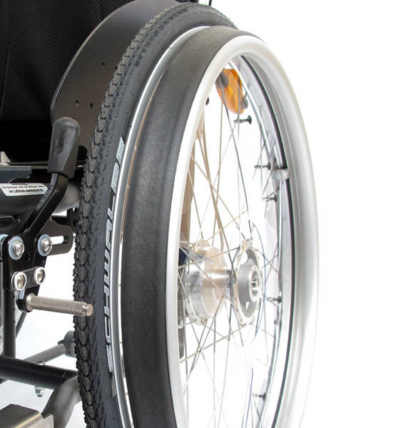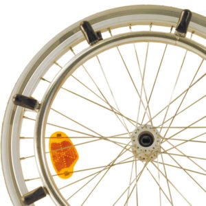 Hier wird der Greifring in der Standardgröße passend zur Radgröße geliefert und im engeren Abstand von ca. 13 mm zur Radfelge montiert.Vorteile der engeren Montage sind die Verringerung der Gesamtbreite des Rollstuhls und eine verringerte Gefahr sich die Finger einzuklemmen.
