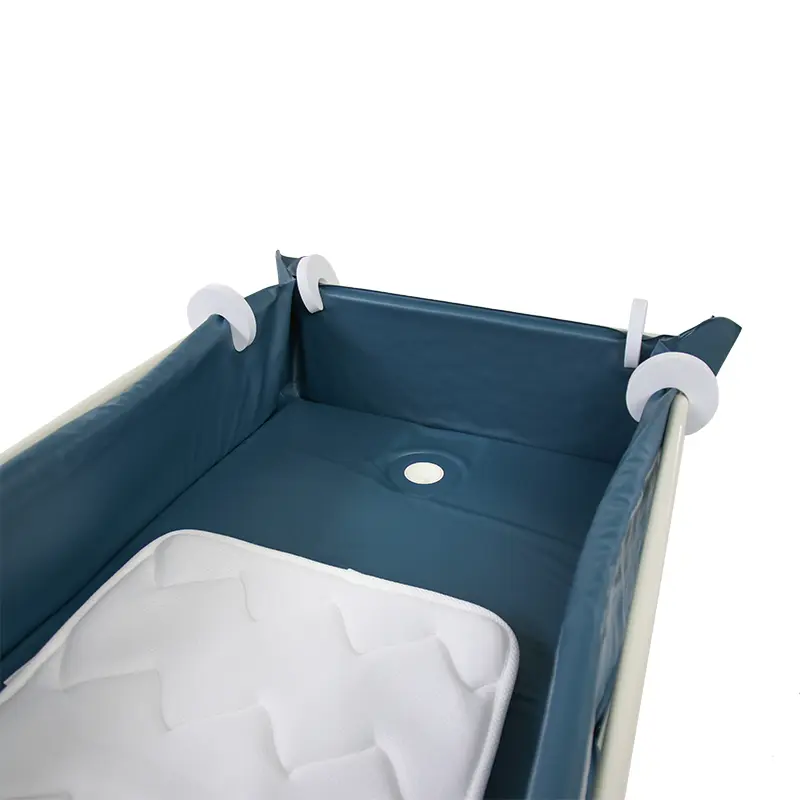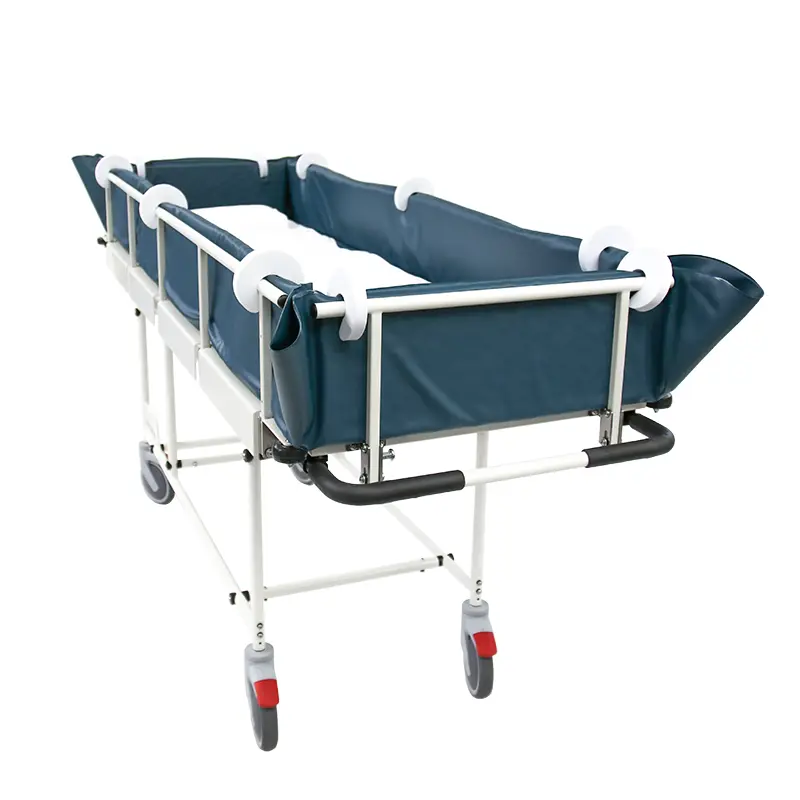 The shower trolley was made to the customer’s desired dimensions and requirements. For easier transfer and for cleaning and disinfecting, 3 sides can be opened. All 4 caster wheels move smoothly and can be locked.