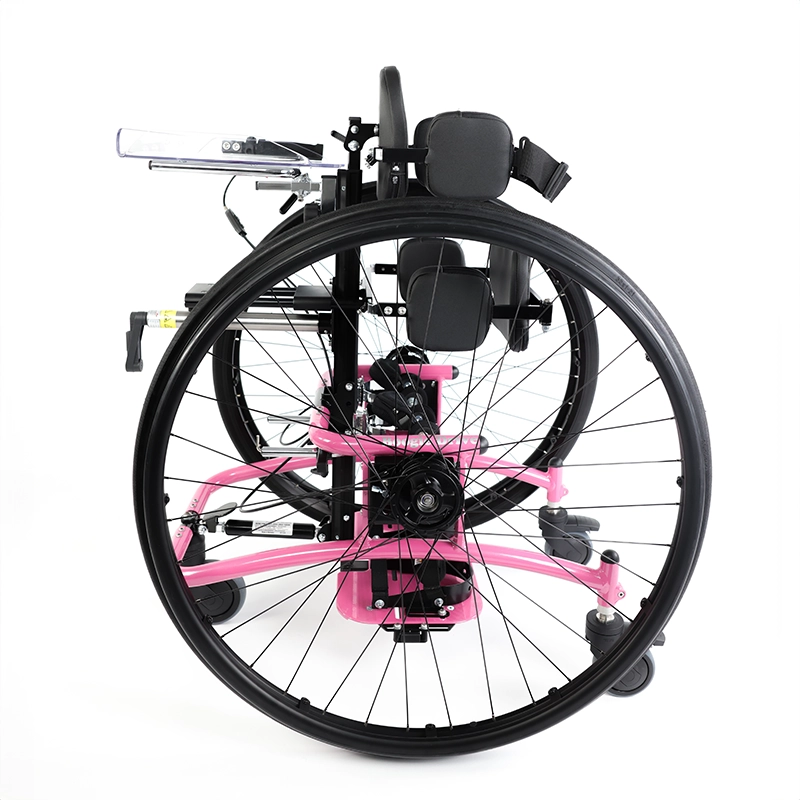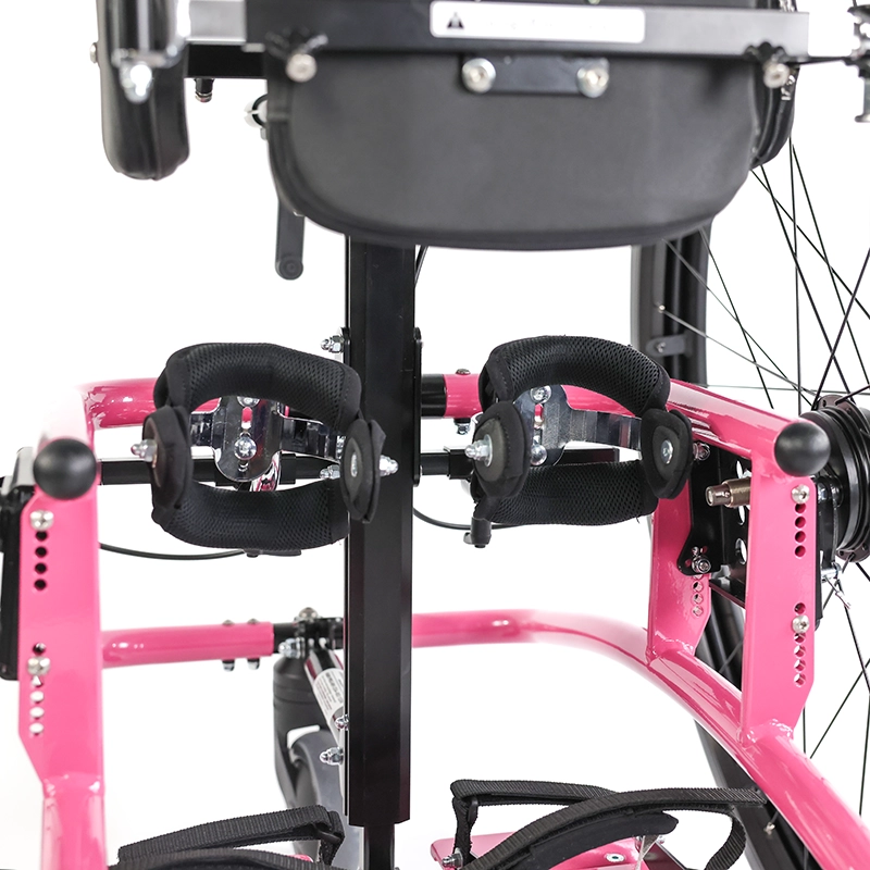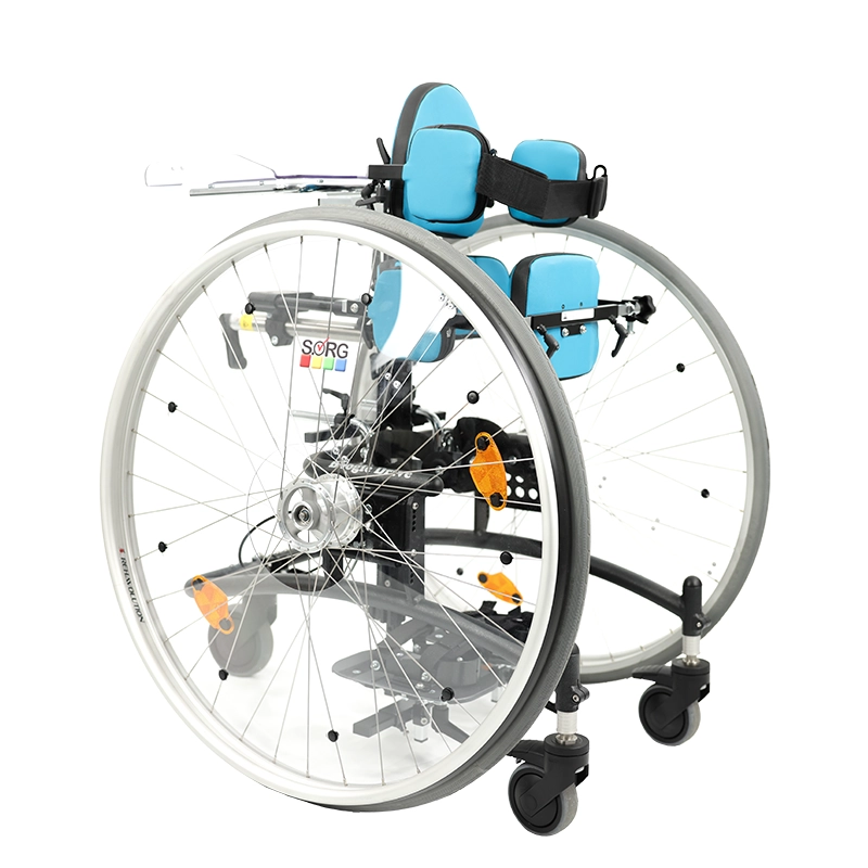 The danger of scoliosis, decubitus ulcers, trauma, spasms, cardiovascular, metabolism and/or digestive insufficiency etc. is distinctly reduced by this. Boogie Drive supports the strengthening and stabilising of the metabolism, the cardiovascular system, the sense of balance, perception, reflex control, the digestive system and breathing. The use of less strength when driving due to the large wheels, the ergonomically ideal shoulder-driving wheel-position, its maneuverability in the smallest space, its child and development suitable, growable dimensions allow the therapeutically sensible use starting in the earliest child years. With the growable frame sizes the upright-therapy can continue into adulthood.