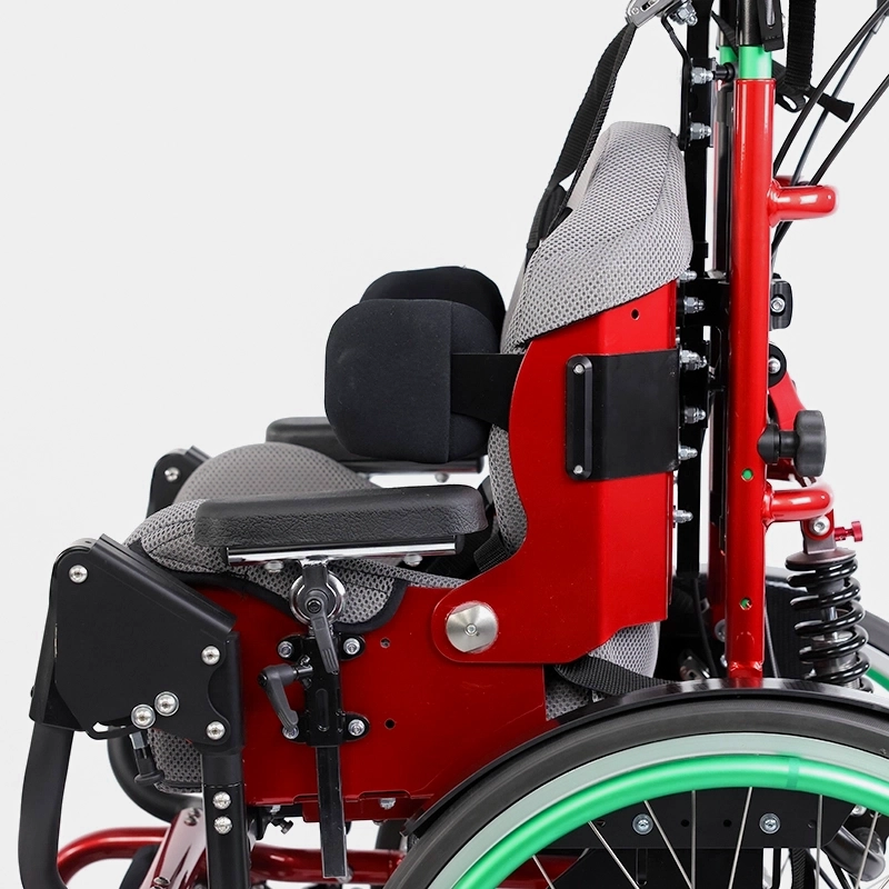 Inflexible restorations often put the user in stable positions, which can lead to tension, pressure points or other contraindications in the patient. The approach of the Dynamis TSD is that the body is not restricted in its freedom of movement, rather involuntary stretching movements (e.g. spasms) are guided over the physiological pivot points and softened by the spring-loaded elements. The integrated rebound function of the spring system supports the return of the patient to the original sitting position. This brings relief for both the user and the caregivers, because repositioning the patient after a stretching phase is not necessary or is less time-consuming thanks to the support.
