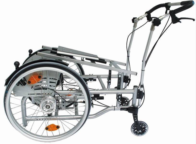 Mit diesem Bauchliegewagen (ergänzt durch eine entsprechende Schale) gelingt es dem Anwender nun, völlig autonom seinen Rollstuhl anzutreiben. Dafür wurden die Antriebsräder nach vorne verlagert, damit er sie auf dem Bauch liegend und mit dem Gesicht in Fahrtrichtung betätigen kann. In den aktiven Phasen wird der Rollstuhl um 35° gekantelt, damit er besser kommunizieren und agieren kann. Die Feststellbremsen wurden ebenfalls in seine Reichweite verlagert. Ebenfalls innerhalb seines Aktionsradius ist die Schale für seine Beatmungsgeräte untergebracht, damit er auch hier ohne fremde Hilfe agieren und hantieren kann.