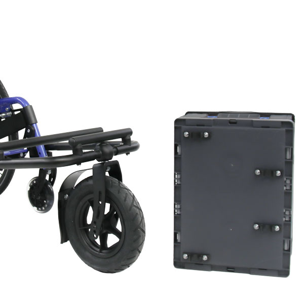 Der Benutzer dieses blauen Jump alpha wünschte sich eine stabile und abnehmbare Klappbox auf seiner Lenk- und Schiebehilfe. Dem Wunsch konnten wir nachkommen und haben die Lenk- und Schiebehilfe mit zwei Querstreben versehen. Eine stabile Klappbox wurde mit passenden Clip-Haltern ausgestattet, damit sie schnell und trotzdem stabil ein- und ausgeclipt werden kann. (Die Klappbox gibt es nur in hellem grau mit roten Griffen.)