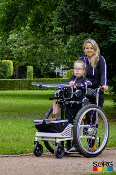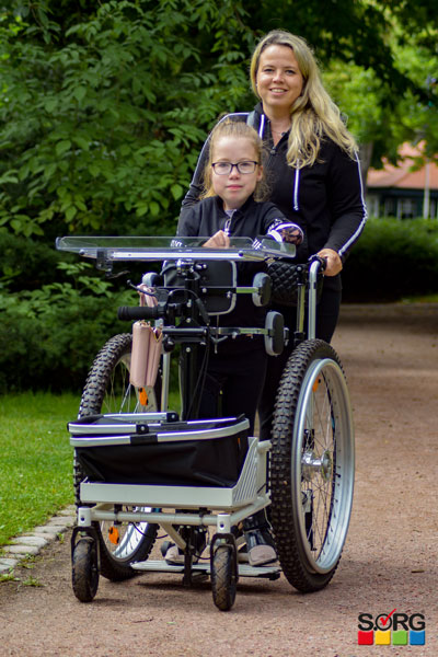 Es wurde also ein Stehrollstuhl benötigt, der von einer Begleitperson geschoben werden konnte und zusätzlich noch mit einer Transportmöglichkeit für den Schulranzen oder einen Korb ausgestattet ist.
