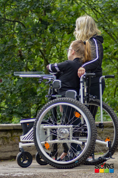 Damit sie nun auf Augenhöhe am Leben teilhaben kann, haben wir unseren Stehfahrer Boogie Drive speziell für sie angepasst. Der Boogie Drive wird normalerweise meist im Innenraum verwendet und hat größere Antriebsräder mit denen sich die Benutzer selbst vorwärtsbewegen können. Damit unsere junge Patientin ihren Stehrollstuhl nun auch im Außenbereich nutzen kann, hat er eine entsprechende Bereifung erhalten. Sowohl die Lenkräder als auch die Antriebsräder sind nun sowohl für Innen als auch für Außen geeignet. Da sie sich nicht selbst antreiben kann, sind die Antriebsräder kleiner als bei einem normalen Stehfahrer und für die Begleitperson wurden höhenverstellbare Schiebegriffe angebracht. Dank der Schiebegriffe und der stabilen Rahmengeometrie des Boogie Drive lässt sich der Stehrollstuhl auch ganz einfach ankippen. Somit sind auch Bordsteine und größere Unebenheiten kein Problem.